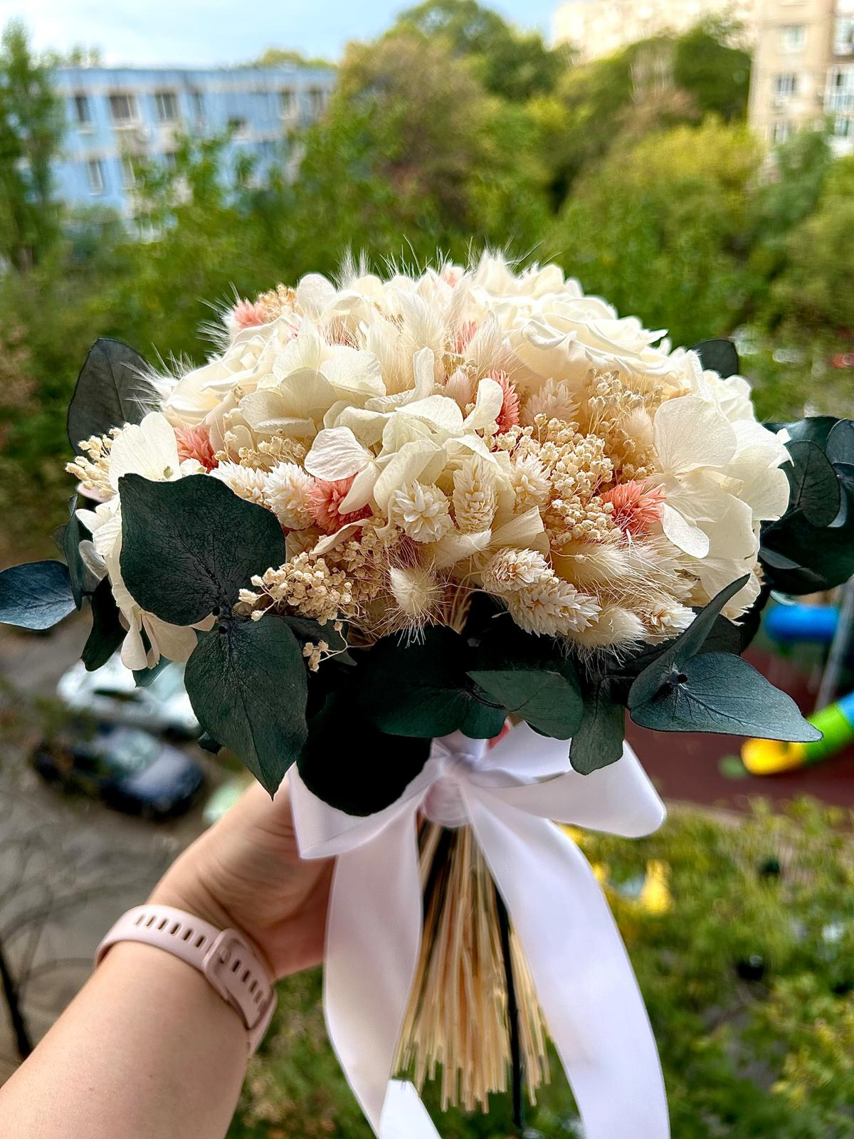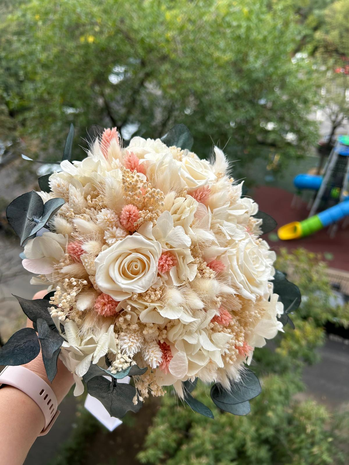 Buchet de mireasă elegant, realizat manual din flori și plante criogenate, păstrate în timp printr-un proces special de conservare. Buchetul este dominat de nuanțe de alb, cu accente discrete de roz deschis, având un aspect natural și rafinat.