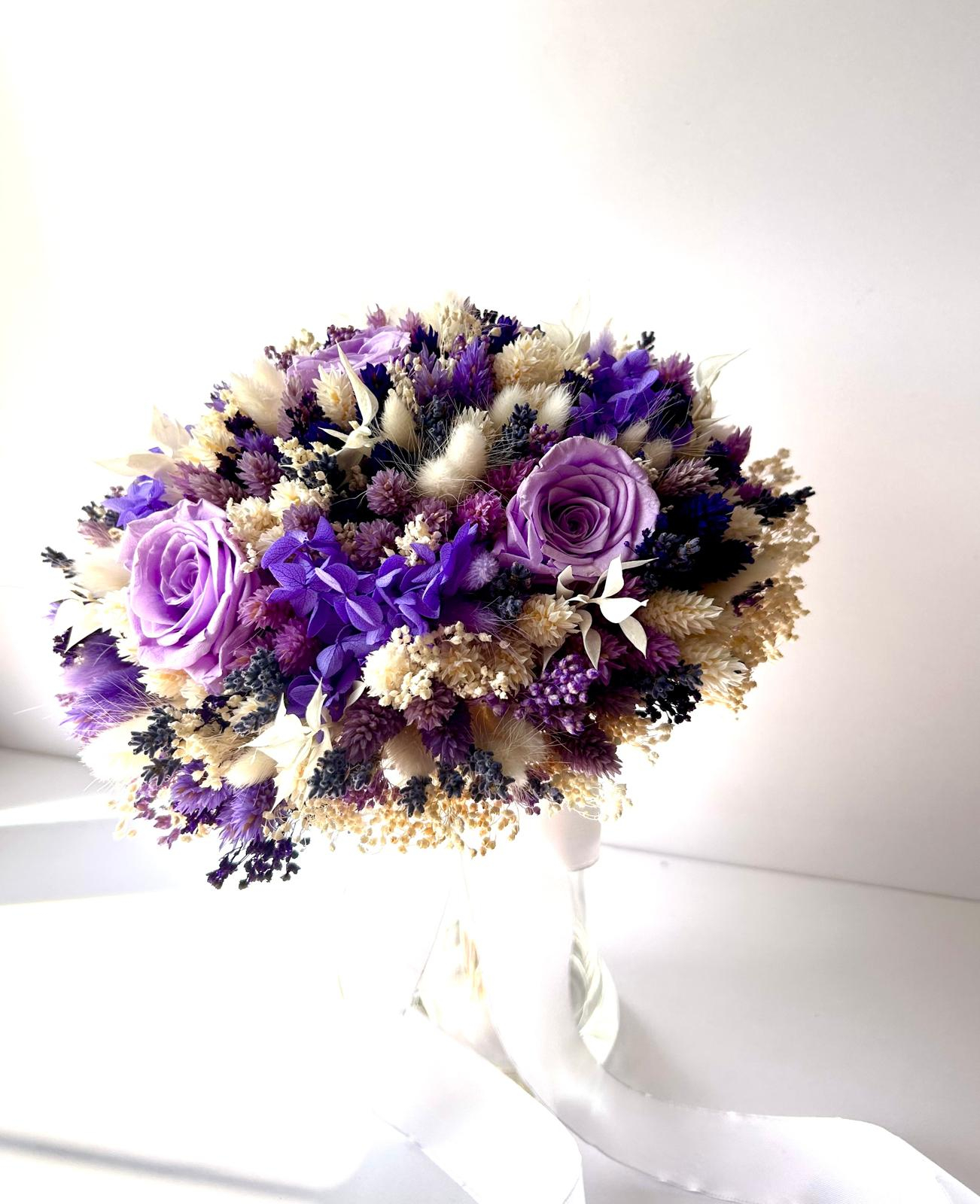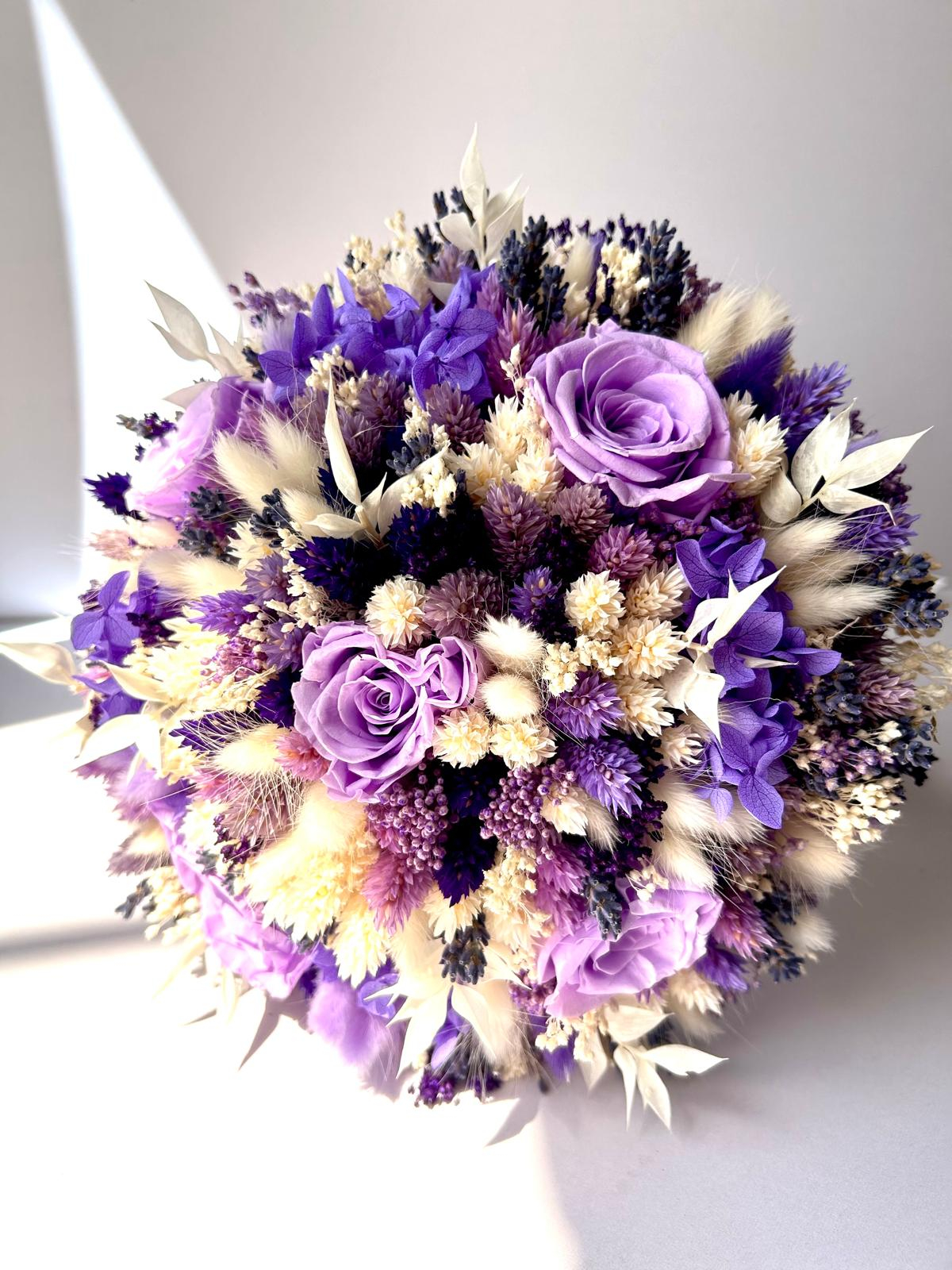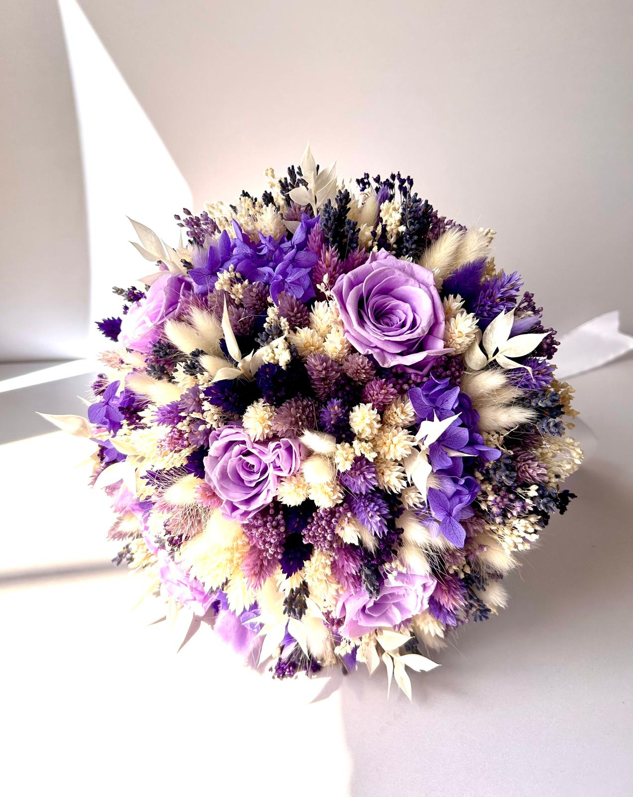 Buchet realizat manual, cu flori criogenate și plante naturale uscate, în nuanțe elegante de alb, lila și mov, ideal pentru mireasă sau nașă. Buchetul îmbină texturi și tonuri delicate, oferind un aspect proaspăt și rafinat, ce se păstrează în timp.