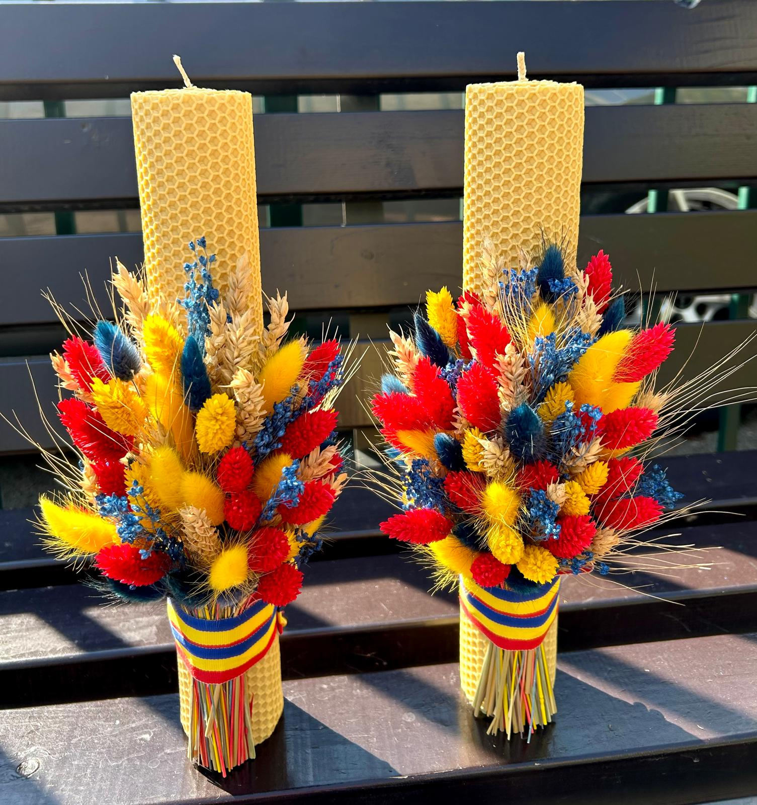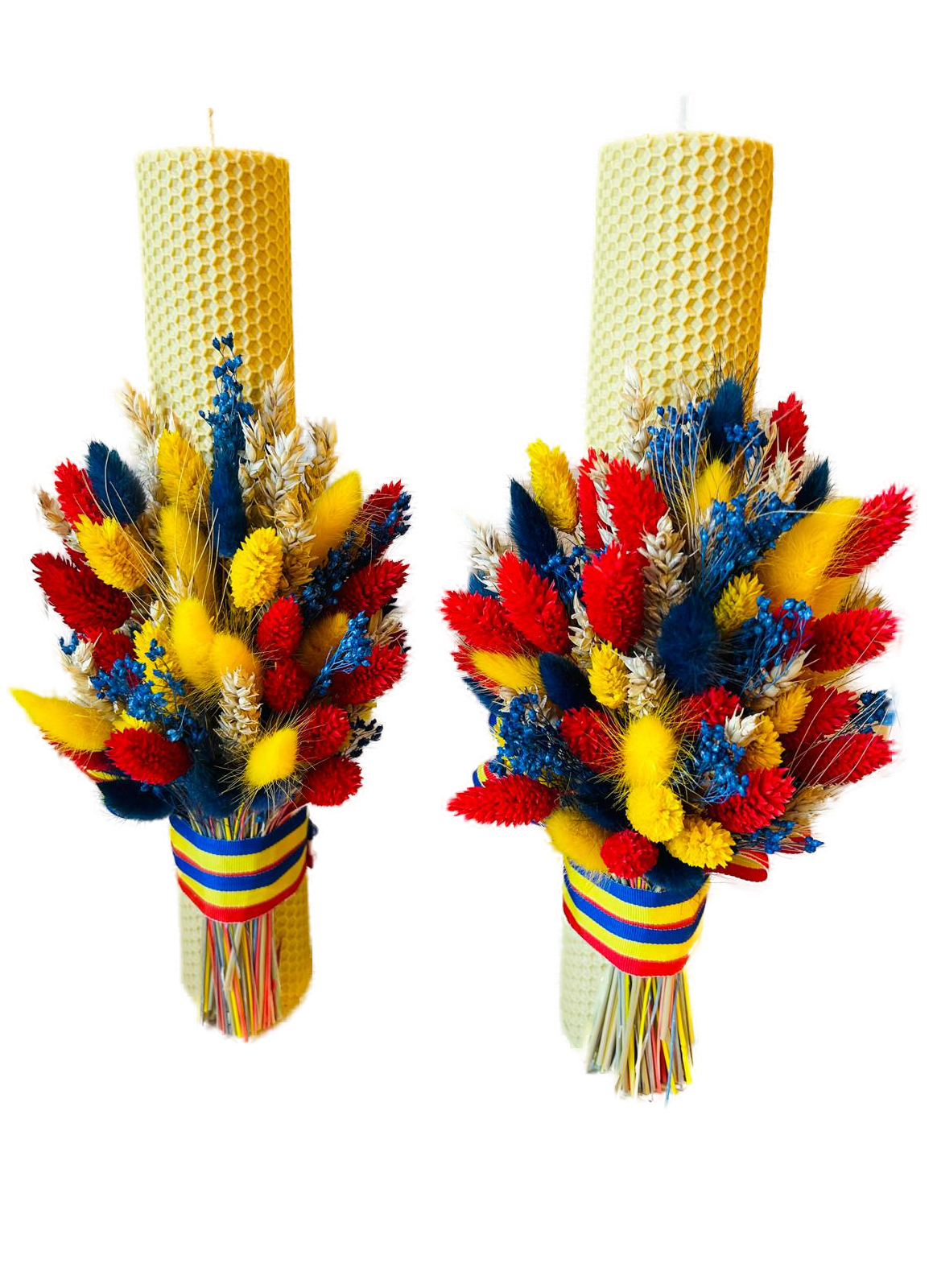 Lumanare nunta/botez, ceara naturala galbena, plante uscate tricolor