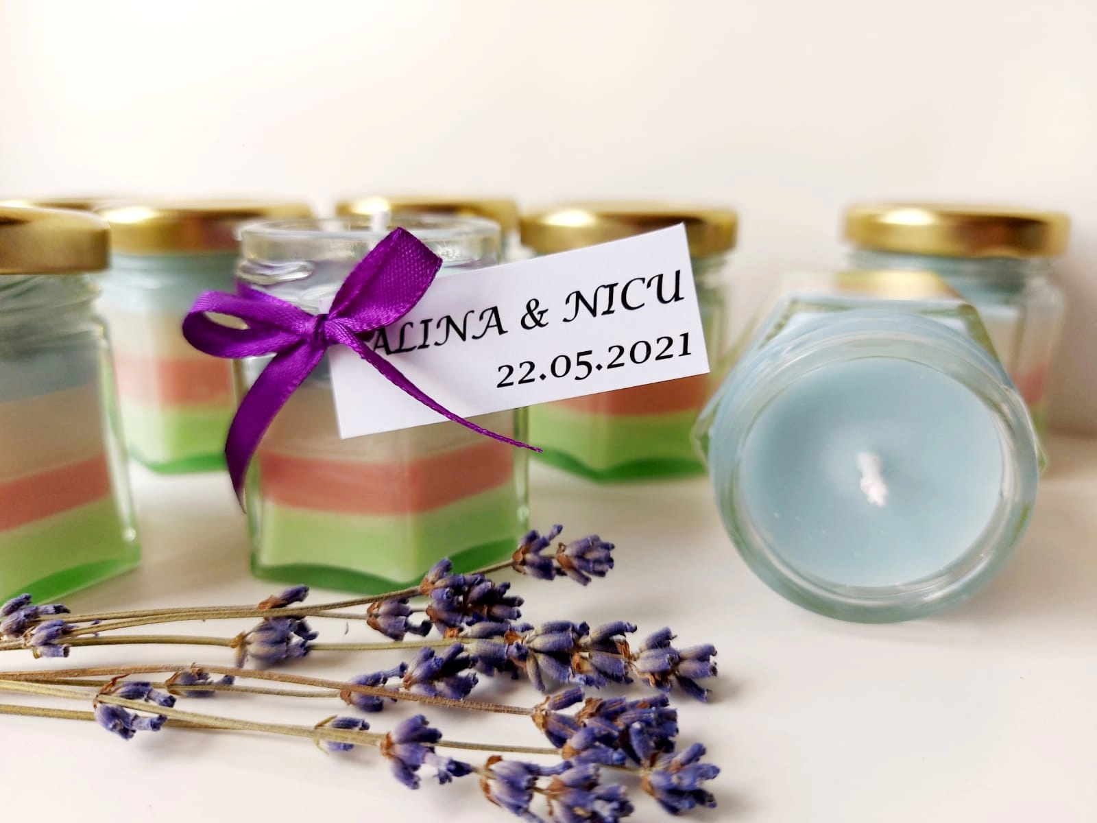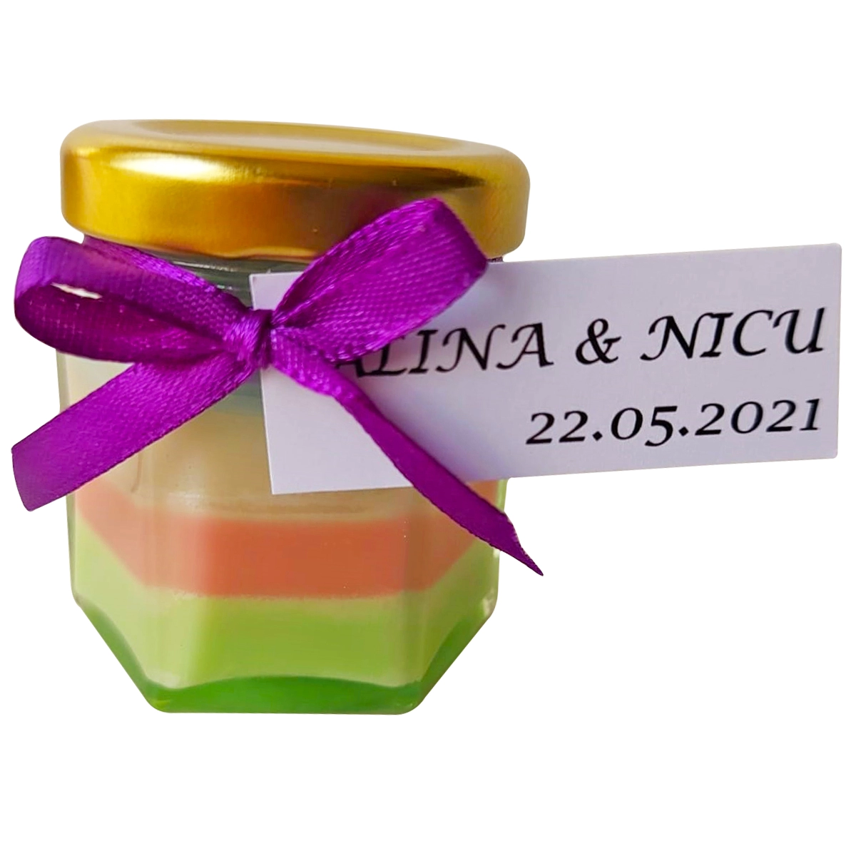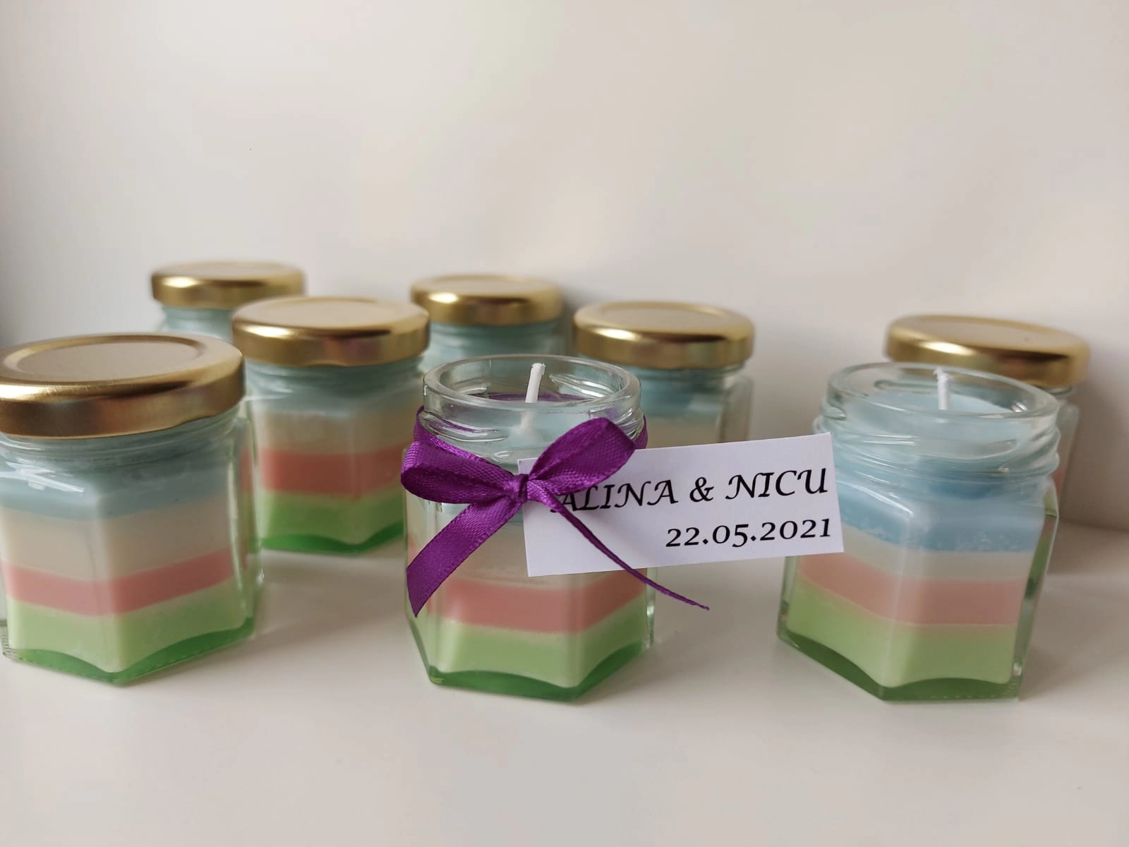 Lumânare decorativa turnata in straturi, borcan hexagon ( aproximativ 50 grame) , ceara de palmier cu parfum de lavanda,scorțișoară, antitabac, etc.