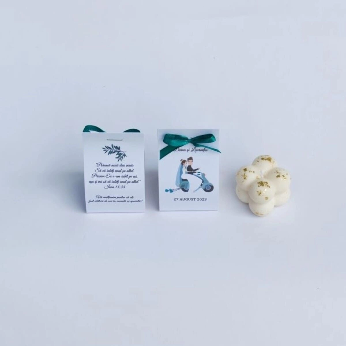 Marturie nunta, lumanare Bubbles, auriu si ambalaj cartonat personalizat