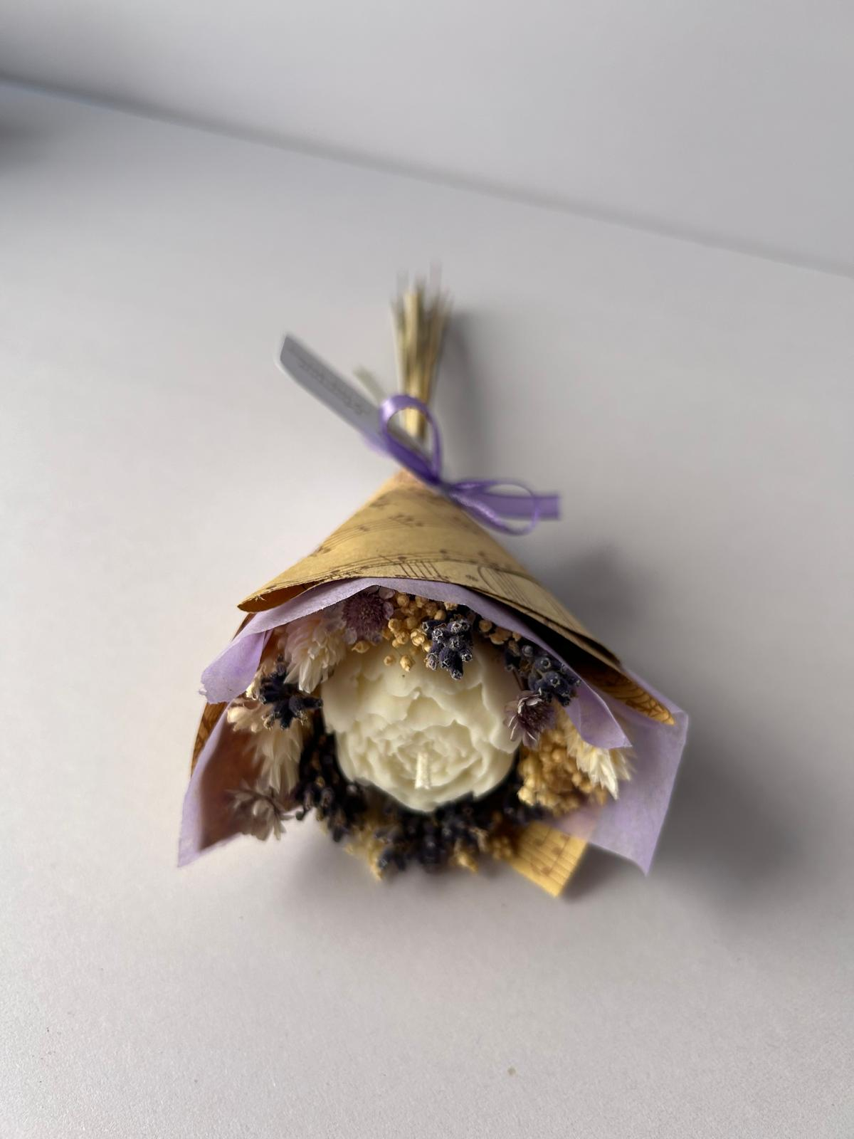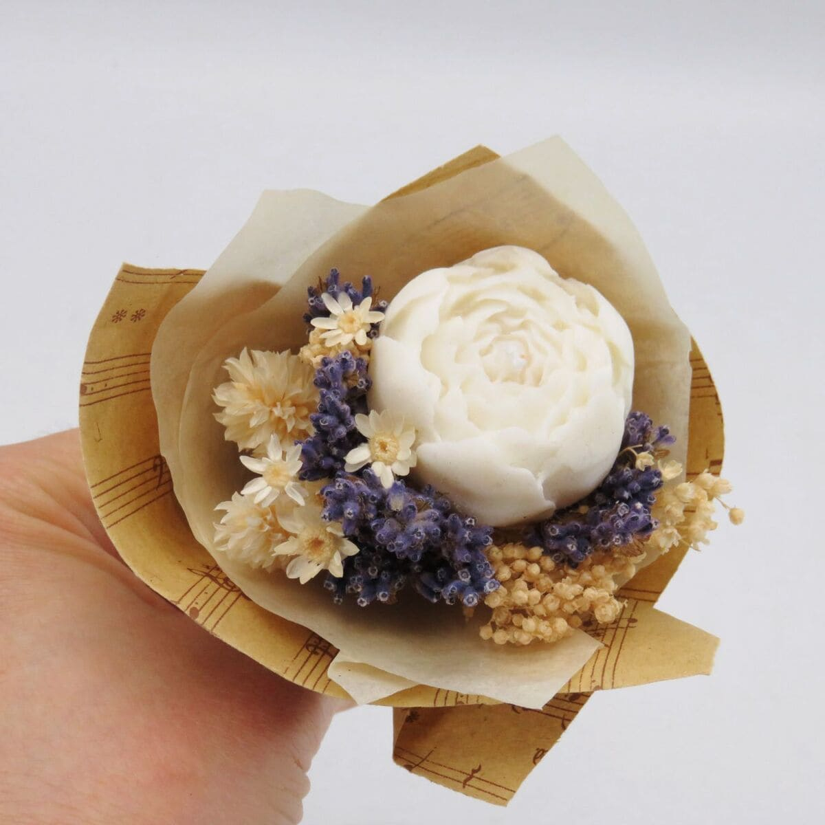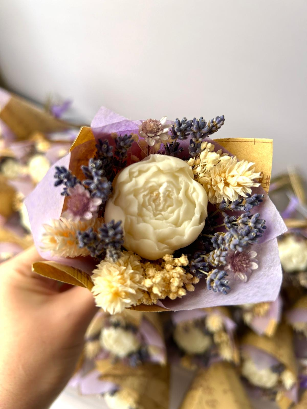 Mărturia mini buchet cu un bujor din ceara de soia lucrata manual prin turnare. Bujorul este parfumat delicat cu aromă de vanilie sau lavanda. Buchetelul este compus si din flori naturale uscate.