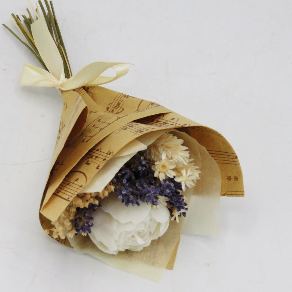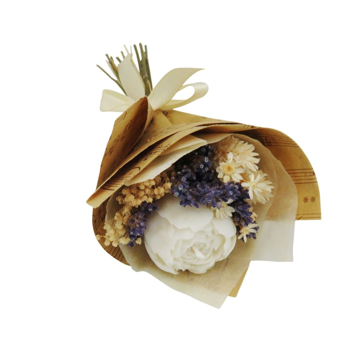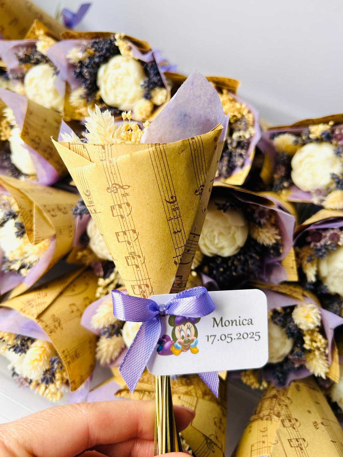 Mărturia mini buchet cu un bujor din ceara de soia lucrata manual prin turnare. Bujorul este parfumat delicat cu aromă de vanilie sau lavanda. Buchetelul este compus si din flori naturale uscate.