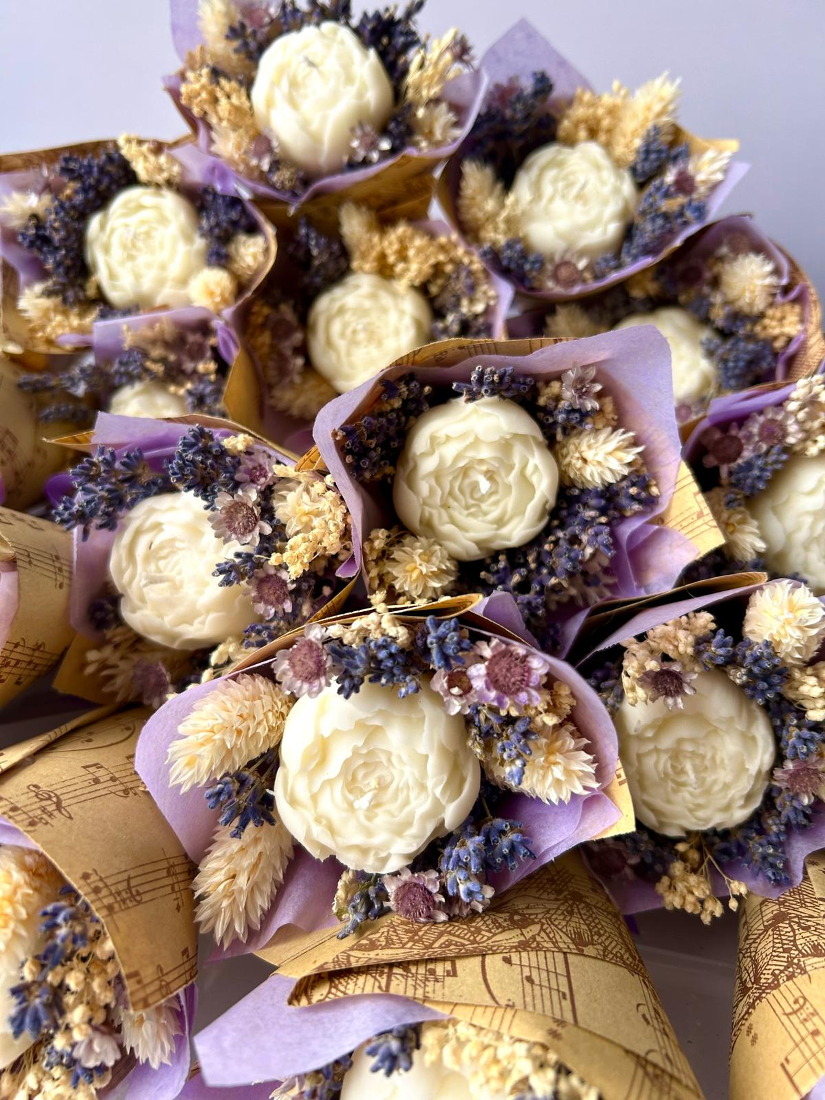 Mărturie buchețel cu Bujor din ceară de soia și lavandă uscată