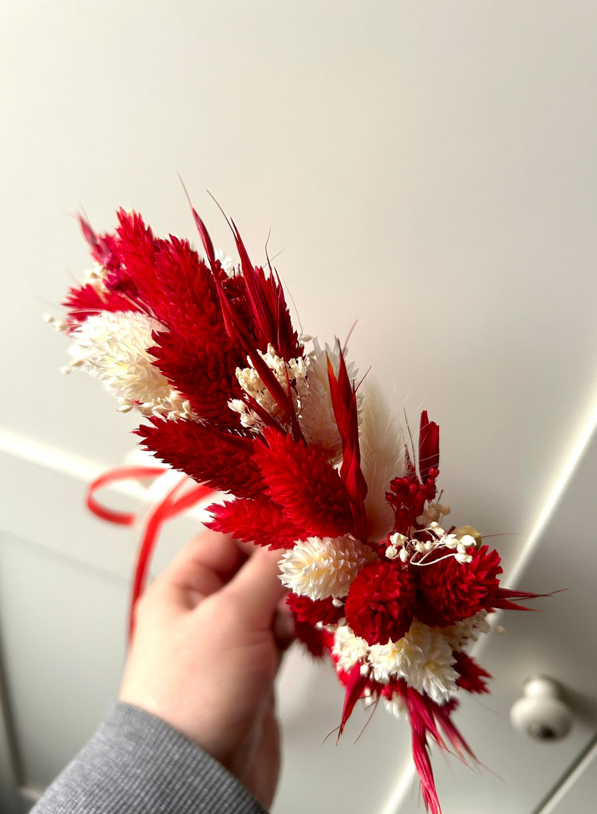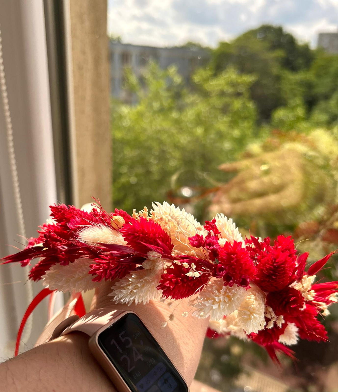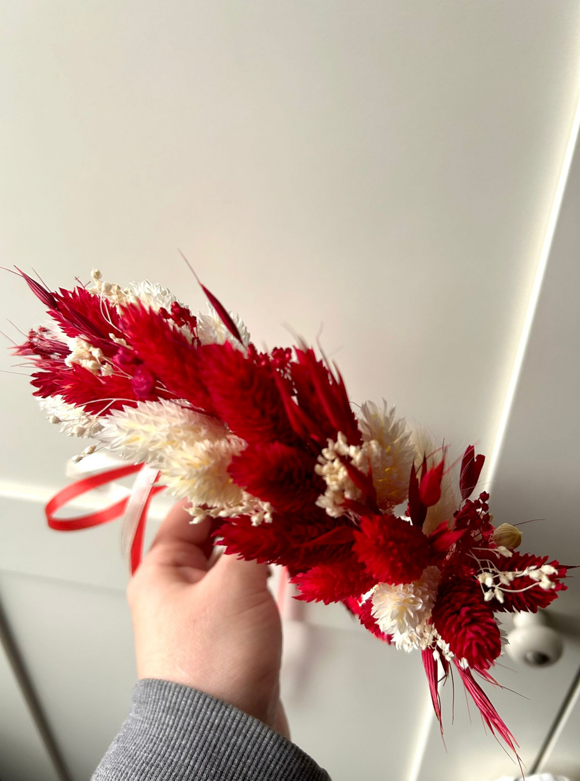 Coroniță din flori uscate – model reglabil, cromatică roșu-alb (sau la alegerea clientului)