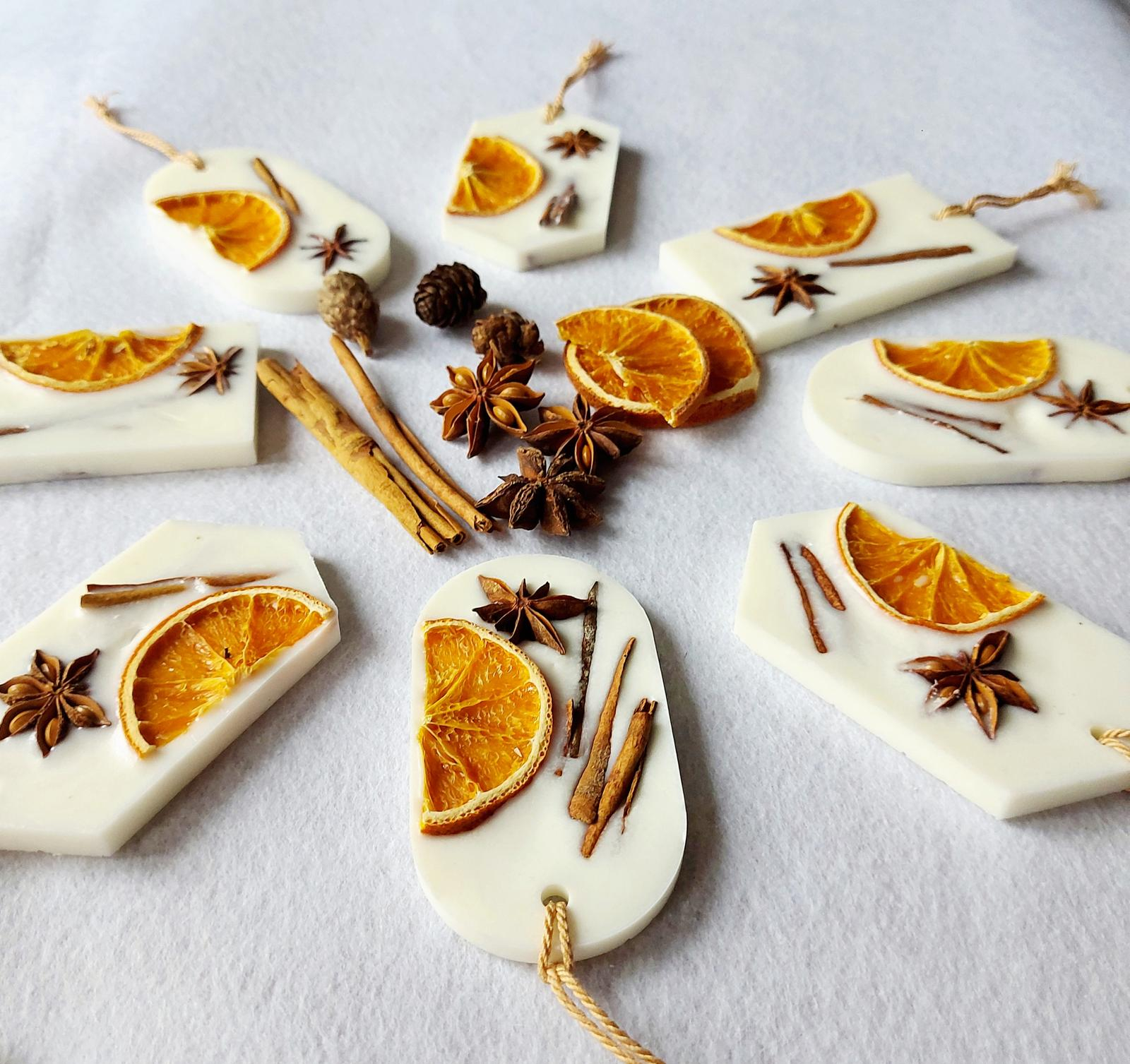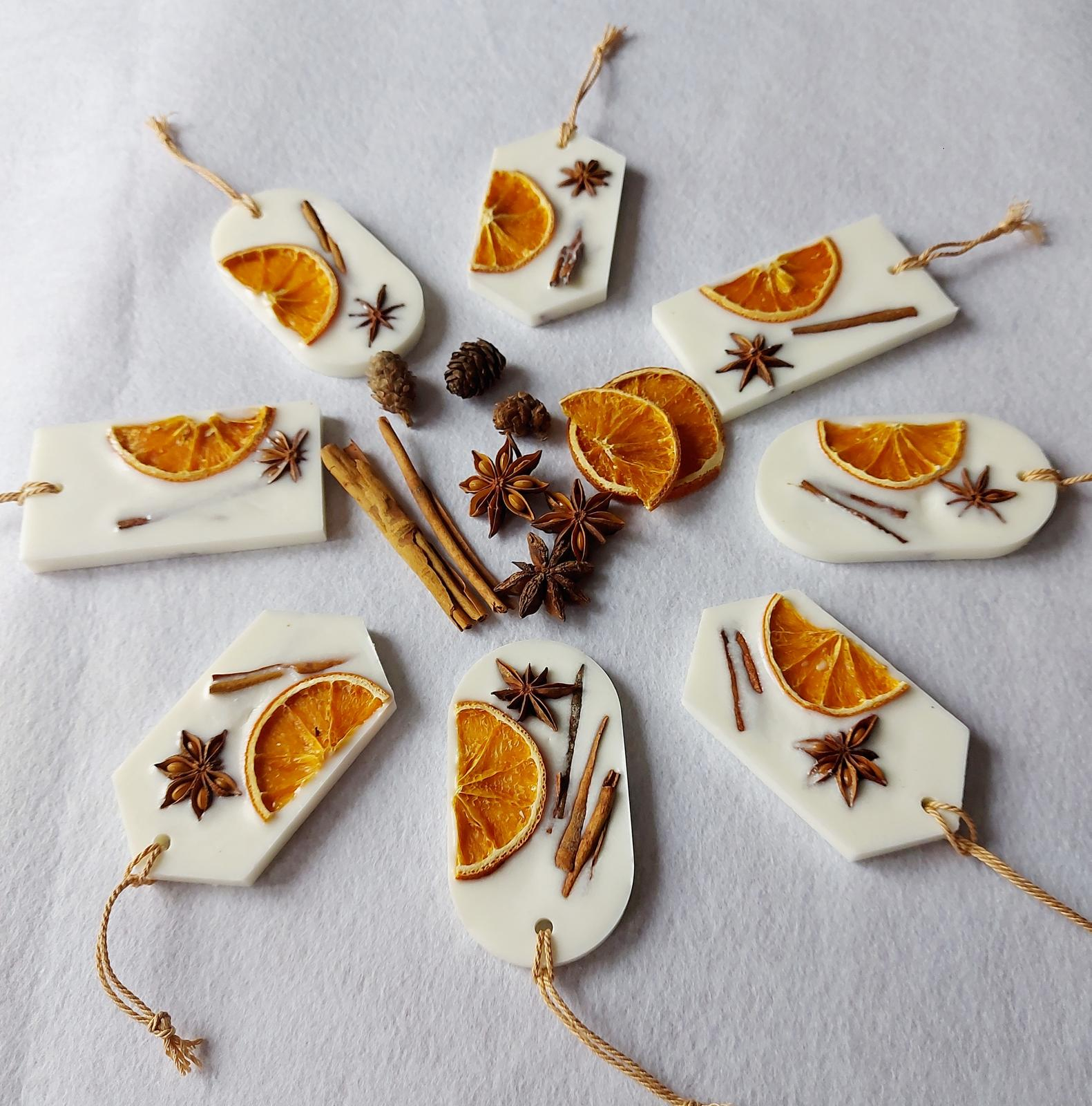 Tablete parfumate cu parfum de portocala, din ceara de soia ce contin felii de portocale uscate, bete de scortioara si anason stelat, numai bune de agățat in brad pe post de glob parfumat !